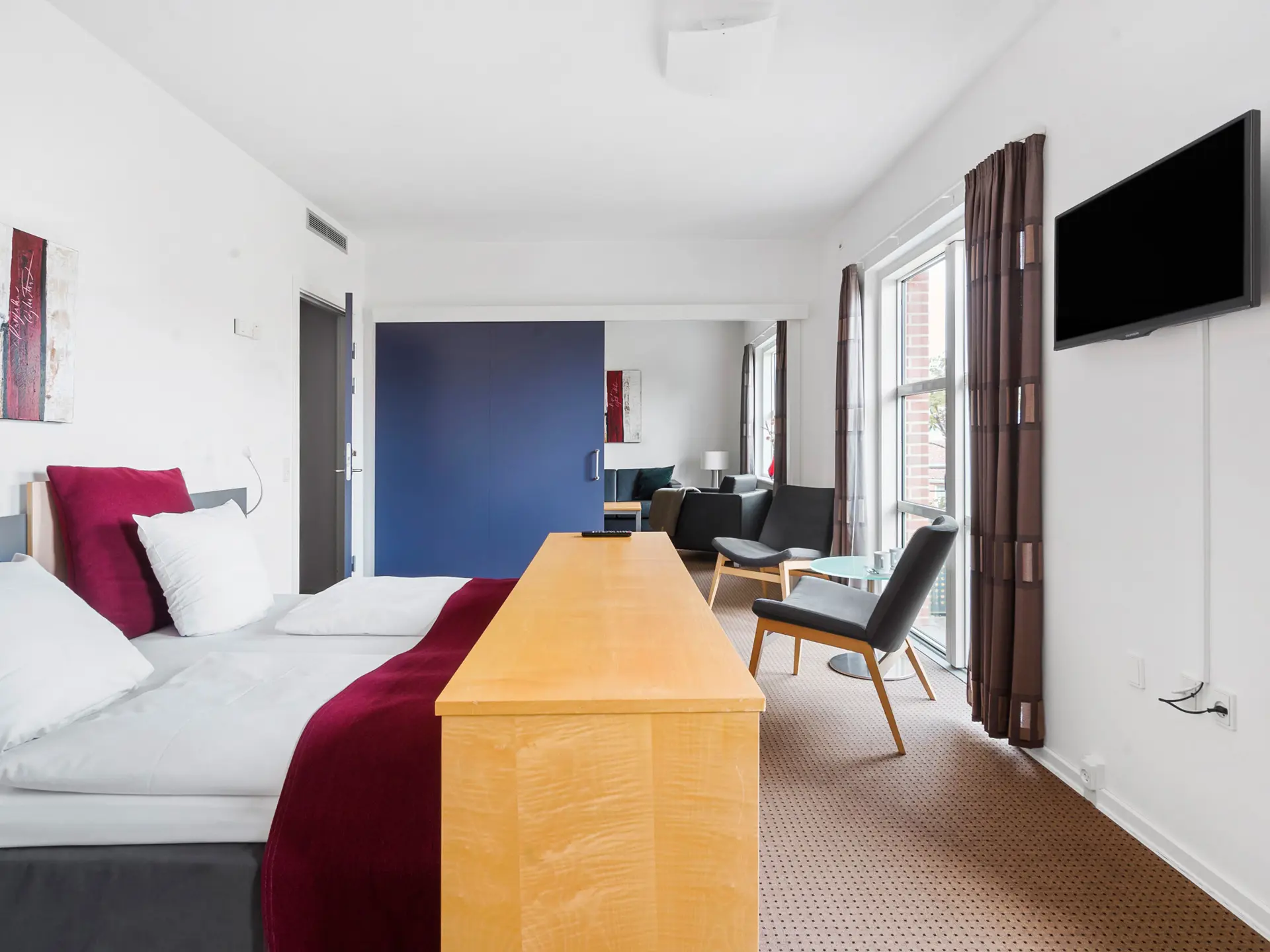 The hotel has a total of 111 rooms and 2 junior suites spread over three floors, where functionality and quality are valued. The rooms differ in their furnishings and are therefore adapted to the guests' needs, whether it concerns a business stay or a family holiday. Some of the rooms have either a balcony or access to a terrace. In some of the rooms, there is also room for the four-legged member of the family for a small additional payment.